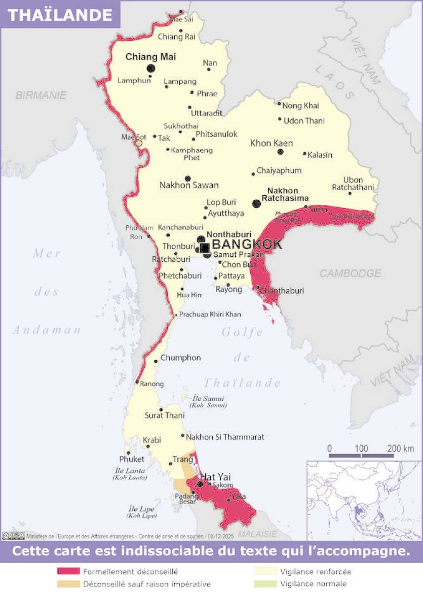 Les zones en rouge sont formellement déconseillées et celles en orange déconseillées "sauf raison impérative".Le conflit frontalier qui oppose, de longue date, la Thaïlande et le Cambodge, a nettement repris de la vigueur cette année, et en particulier ces dernières semaines, causant des morts et l’évacuation d’un demi-million d’habitants. Pour l’heure, pas de cessez-le-feu en vue entre les deux États.