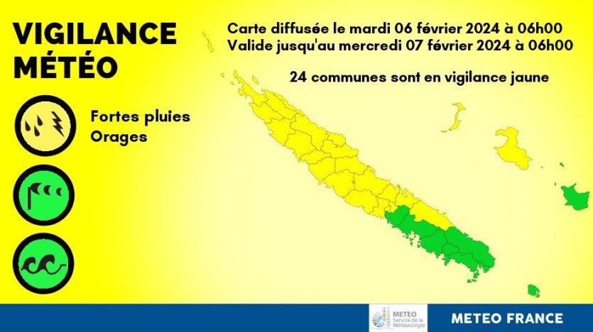 C’est pourquoi 24 communes restent placées en vigilance jaune aux fortes pluies sur la Grande-Terre au nord de Yaté et de La Foa ainsi que sur Lifou, Ouvéa et Bélep.