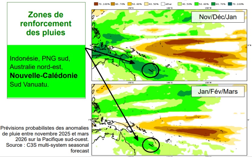 Un épisode La Niña est en train de débuter ce mois-ci, en octobre, annonce Thomas Abinun, climatologue à Météo-France Nouvelle-Calédonie lors de la conférence de présentation de la saison cyclonique, lundi 27 octobre. "On devrait en sortir dans le courant du premier trimestre 2026." Les conséquences de ce phénomène sont multiples. La Niña favorise un environnement océanique plus chaud, un renforcement des précipitations – dont l’intensité est variable selon les épisodes – , des températures plus élevées, moins d’alizé, un temps instable plus fréquent, ainsi que des phénomènes dépressionnaires et cycloniques davantage pluvieux.