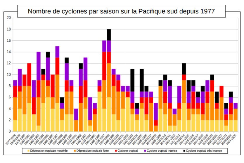 Sur le Pacifique Sud, il n’y a pas eu une seule saison sans cyclone depuis 1977, que ce soit sous l’influence d’El Niño, de La Niña, ou lors d’une période neutre. La moyenne atteint 9,3 phénomènes cycloniques par saison (entre 1977 et 2025) sur la région, et 4 à 5 phénomènes en Nouvelle-Calédonie. Avec La Niña cette année, "le nombre de phénomènes cycloniques, qui couvre les dépressions tropicales modérées jusqu’aux cyclones tropicaux intenses, devrait être normal ou accru, indique Thomas Abinun. Les conditions sont réunies pour avoir une activité cyclonique qui soit au rendez-vous."
