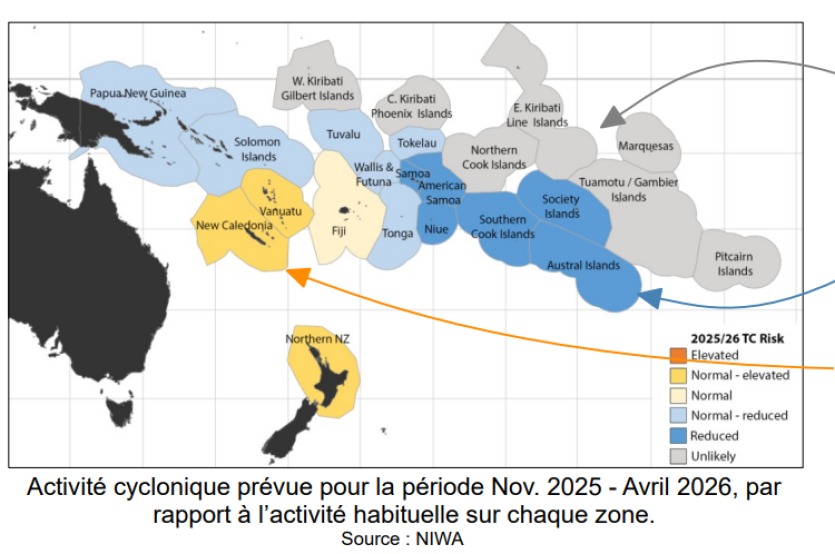 Les îles de la Papouasie-Nouvelle-Guinée jusqu’à la Polynésie française sont "peu exposées aux risques cycloniques", indique Thomas Abinun, de Météo-France. Illustration Niwa (Institut national de la recherche sur l’eau et l’atmosphère)Un risque de cyclones normal à accru