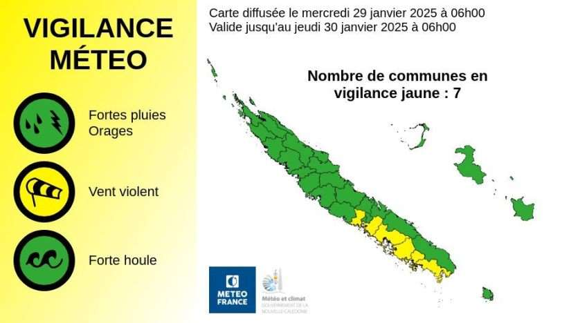 - A.T. | Crée le 29.01.2025 à 09h38 | Mis à jour le 29.01.2025 à 09h38ImprimerSource Météo FranceMétéo France émet une vigilance jaune aux vents forts ce mercredi 29 janvier sur le sud-ouest de la Grande Terre. Une région où le risque de feux de forêt est encore élevé et même très élevé à Nouméa. Prudence.