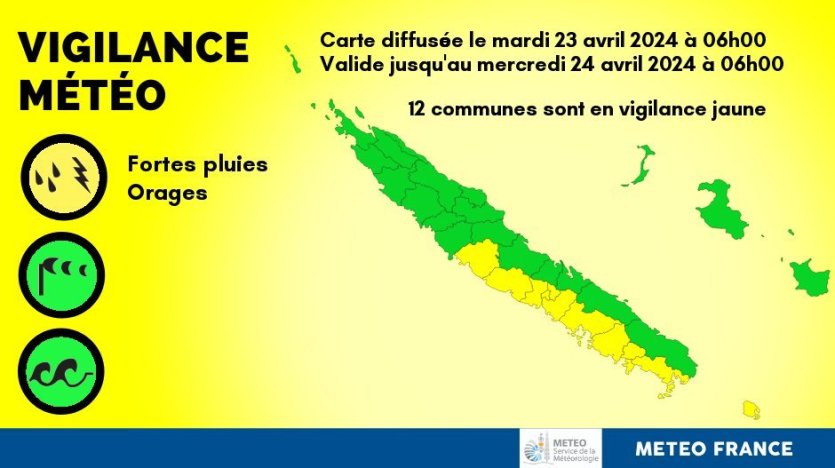 Météo France NC émet une vigilance jaune aux fortes pluies et aux orages pour un risque de fortes averses localement orageuses ce mardi après-midi et la nuit prochaine sur l'ouest de la Grande Terre, de Poya au Mont-Dore, ainsi que sur l'île des Pins.