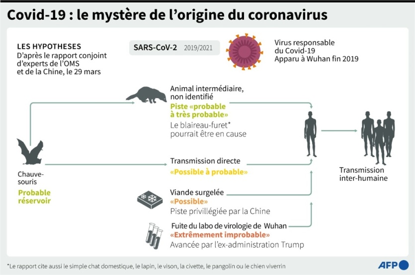 Quelques semaines plus tôt, des experts internationaux dépêchés à Wuhan par l'OMS avaient pourtant jugé "extrêmement improbable" que le virus provienne d'un laboratoire, privilégiant la piste d'une contamination naturelle par des animaux.