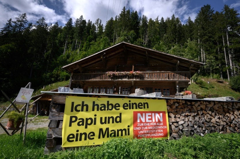 Une affiche contre le mariage pour tous, le 12 septembre 2021 à Jaun, en Suisse Fabrice COFFRINI [AFP/Archives]MERCI DE VOUS IDENTIFIER
