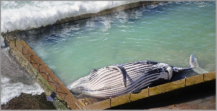 - Australie. Cadavre d'une baleine dans une piscine d'eau salée sur une plageLe corps de cette baleine à bosse, probablement morte depuis plusieurs jours, a été rejeté par la mer dans une de ces piscines artificielles que les Australiens construisent parfois en bord de mer, tout près du rivage, et qui sont remplies d’eau salée. L’animal, dont le poids estIl vous reste 69% de l'article à découvrir.Cet article est réservé aux abonnés.