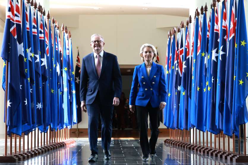 "L’UE et l’Australie sont peut-être géographiquement très éloignées, mais nous ne pourrions être plus proches dans notre vision du monde", a déclaré Mme von der Leyen.