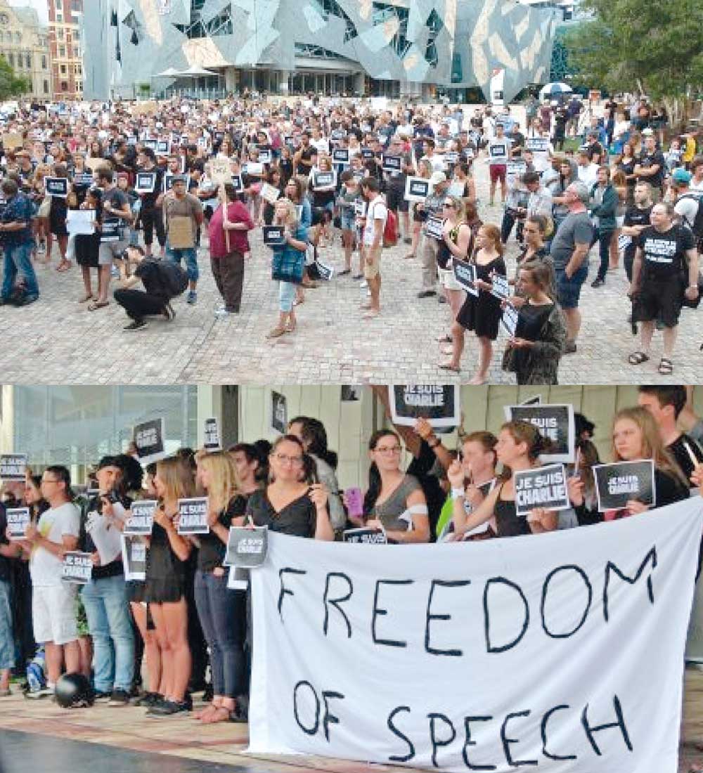 - Australie. De Perth à Sydney, hommage aux victimes de Charlie HebdoA Sydney, Melbourne, Perth et Canberra, les Français d'Australie et les Australiens se sont rassemblés vendredi pour rendre hommage aux douze morts et aux onze blessés de l'attaque de Charlie Hebdo. Reportage à Melbourne.Une grande banderole « Freedom of Speech » (liberté d’expression) sur la scène de Federation Square à Melbourne. Un message de condoléances aux proches des victimes, sur fond de cierges, affiché par la ville de Melbourne sur l’écran géant de la place. Et plus d&rsquoIl vous reste 94% de l'article à découvrir.Cet article est réservé aux abonnés.