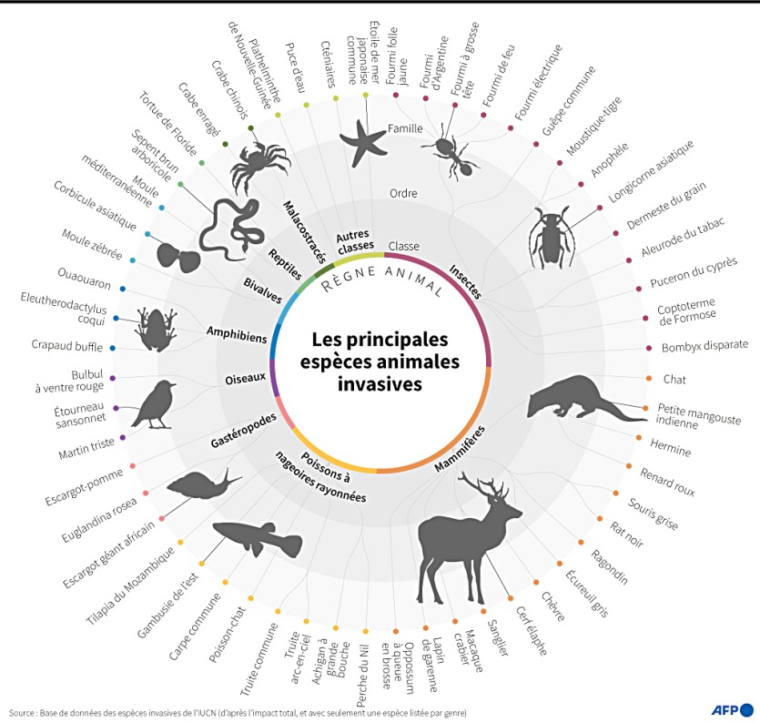 Les principales espèces animales invasives par classe, ordre et famille d’après la base des espèces invasives de l’IUCN. Infographie Sophie RAMIS et Valentin RAKOVSKY / AFPEn 1901, l’Australie décide de construire une barrière de 1 800 km de long dans l’espoir de freiner l’irrésistible progression de la bestiole vers les terres agricoles de l’ouest.