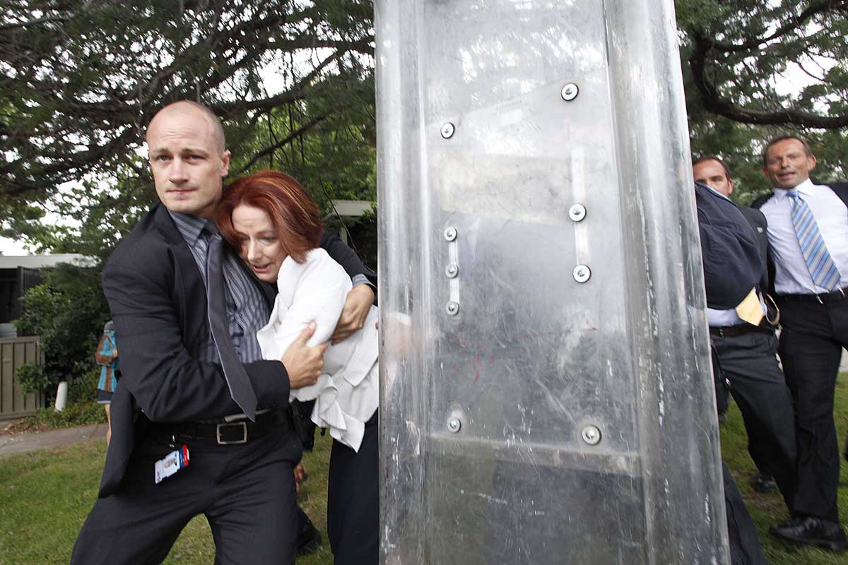 - AustralieJulia Gillard, le Premier ministre, a dû être extraite par les forces de l'ordre d'un hôtel de Canberra après avoir été prise à partie par des Aborigènes qui manifestaient contre la fête nationale.La travailliste Julia Gillard et le chef de l’opposition conservatrice Tony Abbott ont été encerclés par les manifestants qui reprochaient à ce dernier d’avoir réclamé l’éviction d’un camp permanent d’aborigènes dans le centre de la capitale. Les Aborigènes y cIl vous reste 87% de l'article à découvrir.Cet article est réservé aux abonnés.
