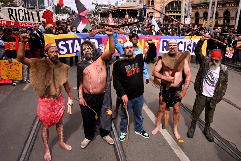 Des militants ont réclamé justice pour les peuples autochtones, beaucoup brandissant des banderoles qui proclamaient : "Ça a toujours été, et ça restera toujours une terre aborigène."