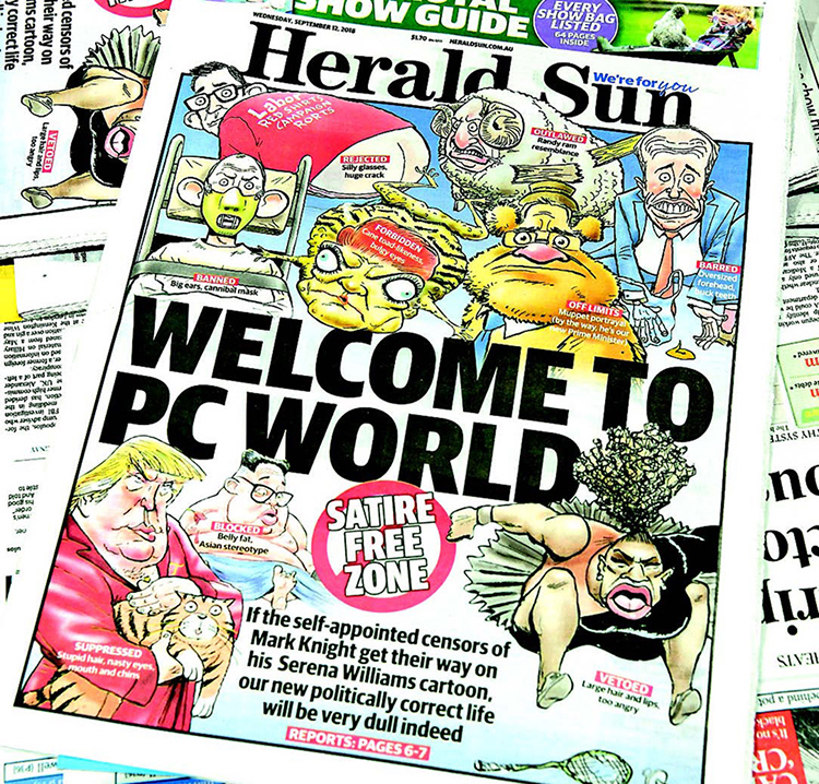 - AUSTRALIE. Le quotidien australien a republié mercredi en « une » un dessin controversé de Serena Williams, en qualifiant de « politiquement correctes » les accusations de racisme qu’elle avait déclenchées.Serena Williams a écopé de 17 000 dollars d’amende pour une spectaculaire colère, dimanche, lors de la finale de l’US Open perdue contre la Japonaise Naomi Osaka. Un événement que le caricaturiste australien Mark Knight a raconté dans un dessin publié lundi par le Herald Sun, où l’onIl vous reste 87% de l'article à découvrir.Cet article est réservé aux abonnés.