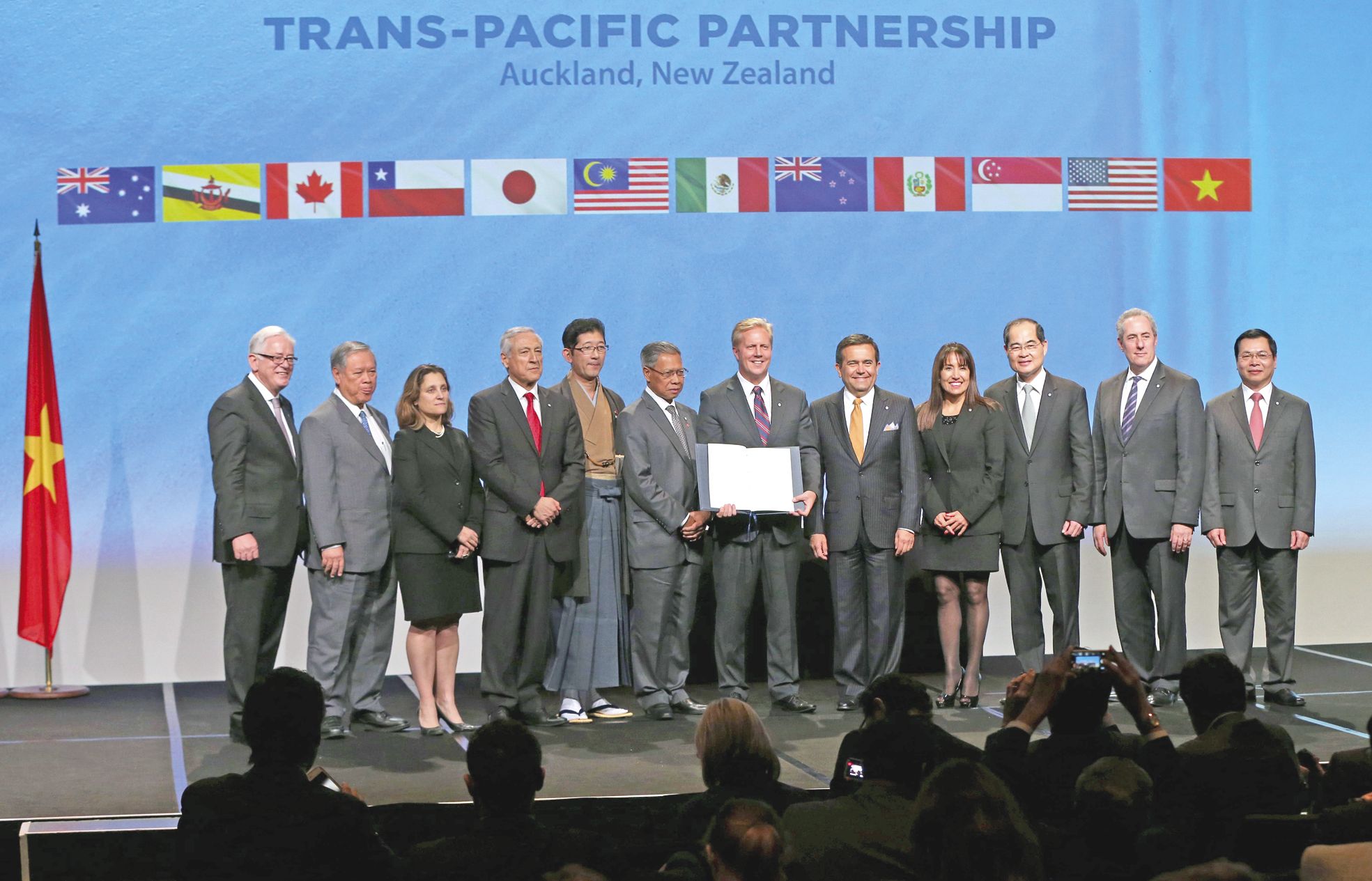 - Nouvelle-ZélandeLes douze pays ont paraphé, hier à Auckland, le traité, qui doit permettre de créer la plus vaste zone de libre-échange au monde.Le TPP vise à abattre les barrières au commerce et à l’investissement entre ses membres, dont les Etats-Unis et le Japon, qui représentent près de 40 % de l’économie mondiale. Le président américain, Barack Obama, a salué, dans un communiqué publié à Washington, la signatureIl vous reste 87% de l'article à découvrir.Cet article est réservé aux abonnés.