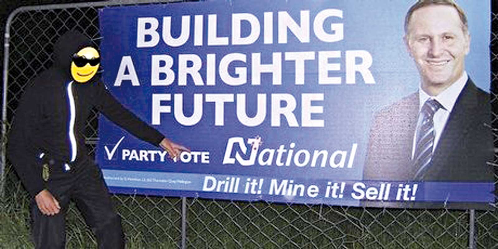 - Nouvelle-ZélandeA huit jours des élections générales, la campagne électorale a pris un vilain tour avec des affaires de vandalisme et d'enregistrements piégés.Sept cents panneaux d’affichage du parti National, le parti du Premier ministre au pouvoir John Key, ont été vandalisés le week-end dernier. Des autocollants ont été posés sur les affiches tels que « Les riches méritent plus » ou « Perce, transforme en mine et vendsIl vous reste 92% de l'article à découvrir.Cet article est réservé aux abonnés.