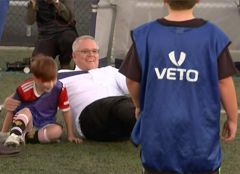 - D'habitude, les hommes politiques embrassent les enfants pendant les campagnes électorales. Scott Morrison, lui, a renversé mercredi un jeune garçon lors d'un match de football amical. Scott Morrison, en bras de chemise mais la cravate toujours nouée autour du cou, jouait au football à cinqIl vous reste 74% de l'article à découvrir.Cet article est réservé aux abonnés.