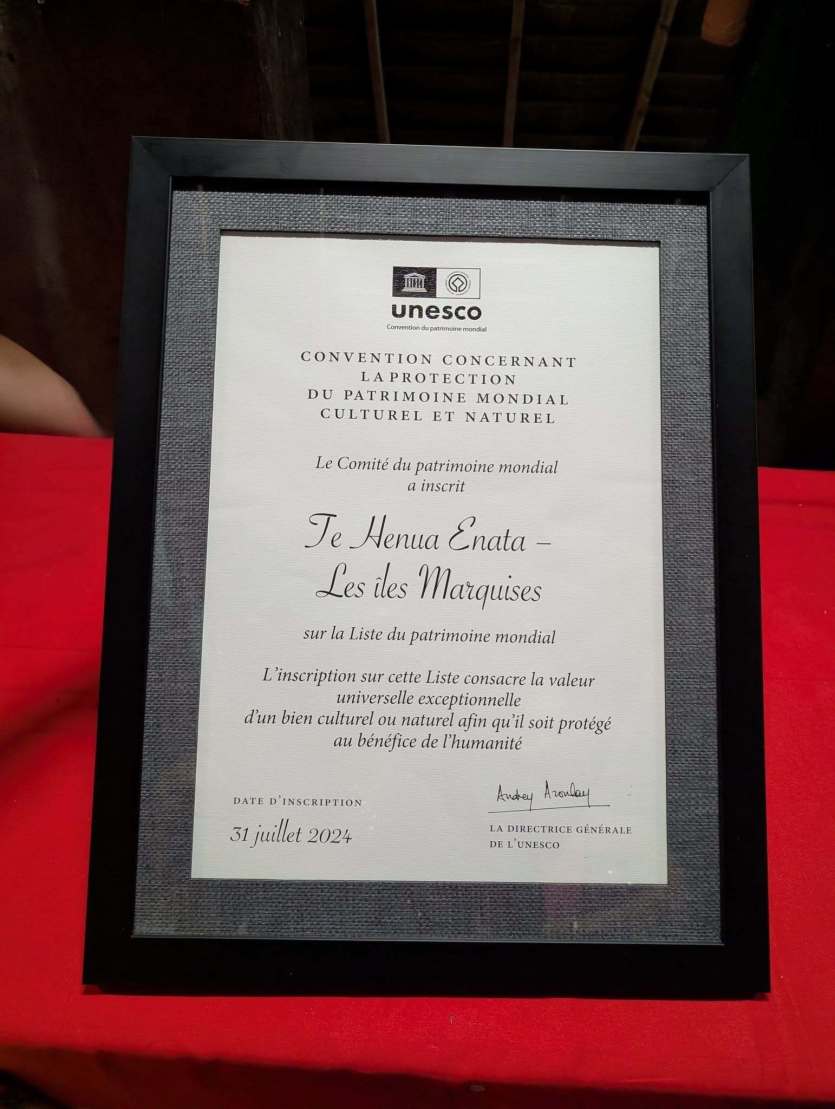 Le document remis par l’Unesco aux maires des îles des Marquises. Photo Présidence PF"Le gouvernement de la Polynésie française se réjouit de cette reconnaissance et souligne la dimension collective de cette inscription, portée par un engagement partagé entre les institutions de l’État, le Pays, la Communauté de communes des îles Marquises (Codim), l’ensemble des hakaiki et des acteurs mobilisés sur le territoire", conclut le communiqué de l’exécutif local.