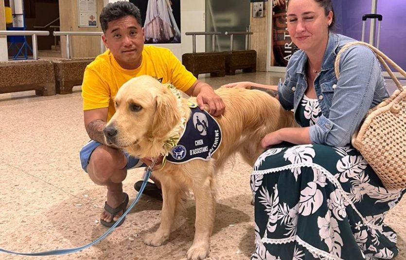Ukyo, un golden retriever de 2 ans, a débarqué à Tahiti avec deux de ses formatrices du centre breton de Handi’chiens. Cette association nationale n’en est pas à sa première livraison de canidés spécialisés : en plus de trente ans d’existence, elle a dressé et formé quelque 3 500 chiens à l’assistance de personnes handicapées, à l’éveil d’enfants touchés par une trisomie ou un trouble autistique, à l’apaisement de patients dans des établissements médico-sociaux… Ou, depuis plus récemment, à l’assistance judiciaire. L’idée est simple : beaucoup de victimes, notamment les plus jeunes, ont des difficultés à traverser les longues procédures judiciaires ou à se livrer auprès des enquêteurs et des magistrats. La présence d’un chien permet souvent de les rassurer.