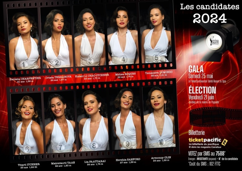 - Vaitiare Pereyre / Radio 1 Tahiti | Crée le 09.05.2024 à 10h07 | Mis à jour le 09.05.2024 à 10h21ImprimerLes dix candidates à l’élection de Miss Tahiti 2024 ont été présentées lundi en Polynésie. Photo Radio 1 TahitiLes noms et les visages des candidates à l’élection de Miss Tahiti 2024 viennent d'être dévoilés lundi. Elles sont dix prétendantes à la couronne portée depuis un peu moins d’un an par Ravahere Silloux. Le gala aura lieu le 25 mai au motu de l’Intercontinental et la grande soirée d’élection est programmée au 21 juin dans les jardins de la mairie de Papeete sur le thème de " Miss Tahiti, perle du cinéma ". Le point avec notre partenaire Radio 1 Tahiti.
