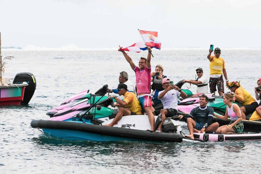 Dès que la cloche de fin de série a sonné, le héros de Teahupo'o a filé dans les bras de l'entraîneur de l'équipe de France Jérémy Florès, seul Français à s'être jamais imposé lors d'une étape du tour pro à Tahiti en 2015.
