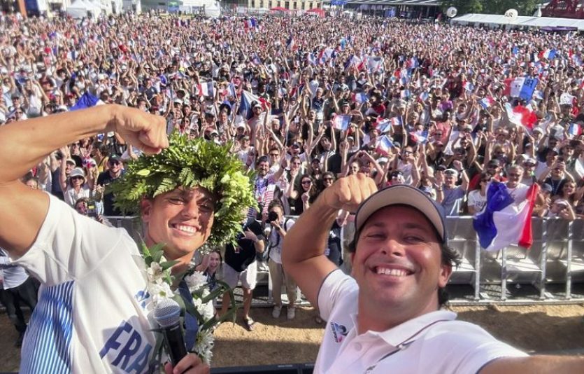 Il hésitait entre les États-Unis pour aller à Huntington Beach, en Californie, où se déroule actuellement une étape des Challengers Series, ou Paris pour fêter sa médaille d’or. Il a donc choisi la seconde option. Kauli Vaast était l’invité du journal télévisé de France 2 ce jeudi soir à Paris. Sur le plateau " spécial JO " qui domine les toits parisiens, il portait un collier de fleurs reçu quelques heures plus tôt alors qu’il était allé au Club France célébrer sa médaille d’or avec le public. Sur des rythmes polynésiens, et entouré de dizaines de drapeaux tricolores, il a fait quelques pas de danse – très commentés sur les réseaux sociaux – sous les acclamations d’une large foule réunie, comme tous les jours depuis le début de ces jeux, sur l’esplanade de la Villette. " Magic Moment ", commente Michel Bourez sous les photos de cette ovation, postées par Jérémy Florès.
