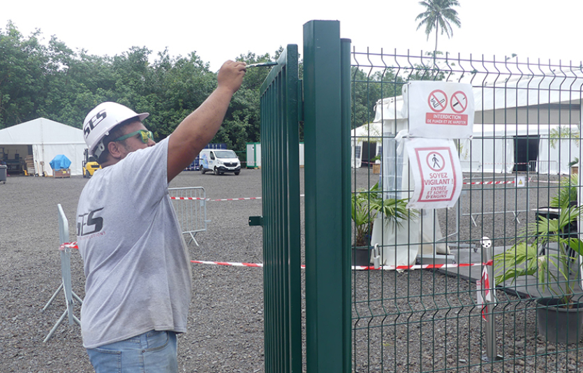 Au domaine Rose, à Teahupo’o, les derniers coups de pinceaux viennent habiller les clôtures du futur centre opérationnel des Jeux. Photo Waldemar de Laage / Radio 1 Tahiti"Hâte que ça se finisse"