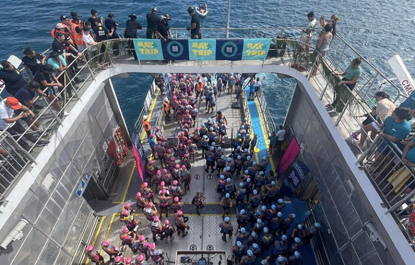 Les 350 athlètes présents au départ se sont élancés depuis le Tauati Ferry. Photo Damien Sanchez / Radio 1 TahitiMalgré cette absence de taille, y avait tout de même du beau monde dans l’eau, 350 concurrents sur les deux distances, pour cette 4e édition. L’épreuve a dû s’adapter à une météo venteuse et une mer déchaînée en baie de Cook, avec le décalage d’un départ ou le remplacement d’une section natation pour de la course à pied. Les deux Calédoniens ont fait la différence à mi-parcours. " Le courant était compliqué à gérer, puisque nous ne nageons qu’en eau douce en Calédonie ", en raison des craintes liées aux requins. Et " contrairement à chez nous, il y avait des parties sur route et des montées extrêmement raides, donc c’était casse-pattes ", jugent les deux coéquipiers, qui ne disputaient que leur 3e course ensemble.