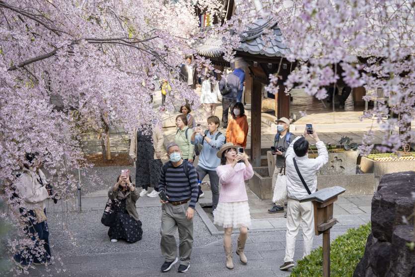 Dans l’ancienne capitale impériale de Kyoto, les autorités ont déclaré lundi 30 mars la pleine floraison après avoir examiné un arbre de référence dans l’enceinte du château de Nijo, site inscrit au patrimoine mondial. Les fleurs de cerisiers dans les temples et sanctuaires historiques de la ville sont particulièrement prisées des visiteurs et des habitants.