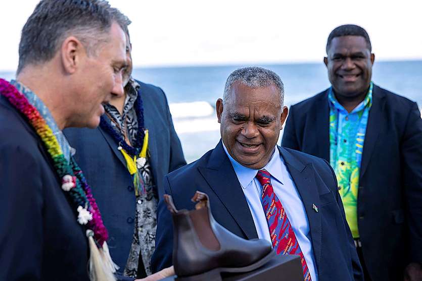 - AFP | Crée le 14.08.2025 à 05h00 | Mis à jour le 14.08.2025 à 05h00ImprimerLe vice-Premier ministre et ministre de la Défense australien, Richard Marles (à gauche) remettant une chaussure au Premier ministre du Vanuatu, Jotham Napat (au centre), sur l’île de Tanna, le mercredi 13 août. Photo AFPL’Australie a salué, ce mercredi 13 août, une avancée décisive dans les efforts visant à signer un accord de sécurité avec le Vanuatu, qui pourrait affaiblir l’influence de la Chine dans ce pays. L’accord comprend également une partie développement économique et adaptation au changement climatique.
