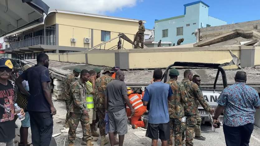 - AFP | Crée le 18.12.2024 à 07h26 | Mis à jour le 18.12.2024 à 08h16ImprimerDes forces de sécurité du Vanuatu et des habitants entourent un bâtiment détruit par le séisme, à la recherche d’éventuelles victimes. Photo AFP - MICHAEL THOMPSONLe tremblement de terre survenu mardi 17 décembre a déjà fait quatorze morts, selon un dernier bilan, et d’importants dégâts. La France a dit se tenir prête "à contribuer aux opérations de secours" si les autorités vanuataises le demandent.