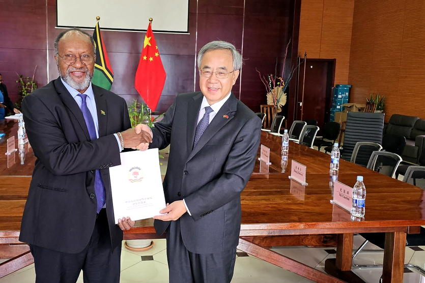 - AFP | Crée le 02.07.2024 à 14h59 | Mis à jour le 02.07.2024 à 14h59ImprimerLe Premier ministre de Vanuatu, Charlot Salwai, serre la main de Hu Chunhua, un représentant chinois, mardi lors d’une cérémonie officielle de remise du nouveau palais présidentiel au gouvernement de Vanuatu. Photo AFPLa Chine a livré symboliquement mardi les clés d’un nouveau palais présidentiel au Vanuatu où elle finance d’autres bâtiments gouvernementaux, autant de projets qui risquent de raviver les inquiétudes quant à l’influence de Pékin chez nos voisins.
