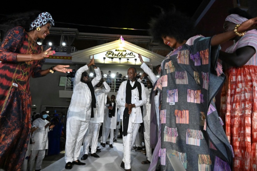 Le couturier ivoiro-burkinabè Pathe'O (C), salué par ses mannequins, lors d'un défilé marquant ses 50 ans de carrière, à Abidjan le 29 mai 2021 Issouf SANOGO [AFP]MERCI DE VOUS IDENTIFIER
