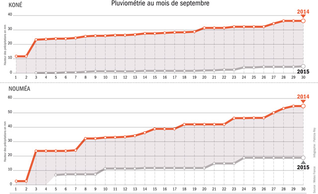 - La Nouvelle-Calédonie a enregistré, en septembre, des précipitations bien inférieures à celles de l'année dernière. L'arrivée du phénomène El Niño ne va qu'accentuer la sécheresse. Avec des conséquences sur l'élevage et sur les risques d'incendie.Le constat est édifiant. Le mois de septembre a été terriblement aride comparé à l’an dernier. « Nous avons franchi un degré dans la sévérité de la sécheresse. Et elle ne va qu’empirer », s’alarme Alexandre Peltier, chef de la division climatologie à Météo-Il vous reste 96% de l'article à découvrir.Cet article est réservé aux abonnés.