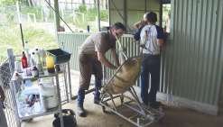 Dans certains élevages, des béliers Dorper sont déjà en reproduction depuis plusieurs années. « Mais il faut cinq ou six générations pour atteindre une race pure. Avec ces transferts, on accélère la cadence », précise Joseph Castegnaro, de Poya, un des deux éleveurs, avec Daniel Guépy, de La Foa, à avoir envoyé des bêtes à Port-Laguerre ces derniers jours. Après 10 jours de « synchronisation des chaleurs », par un traitement hormonal notamment, les brebis Dorper de la station zootechnique ont été inséminées avec de la semence de béliers australiens. « 5 à 7 jours plus tard, on peut récolter des embryons “pur race?? qui sont implantés sur les receveuses : une centaine de brebis des éleveurs et 80 de chez nous », détaille le responsable de la station zootechnique.