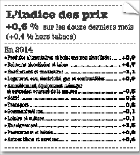 - n Economie. Bilan de l'Institut de la statistique et des études économiquesDans son dernier bilan, l'Isee fait état d'une faible inflation sur l'année 2014. Sur les douze derniers mois, les prix sont en hausse de 0,6 %, contre 0,7 % en 2013.Une inflation « très modérée ». L'Institut de la statistique et des études économiques (Isee) a publié, hier matin, l'indice des prix à la consommation du mois de décembre, ainsi que le bilan de l'inflation en 2014. Résultat : cette dernière a augmenté de 0,6 % en un an (contre 0,7 % enIl vous reste 74% de l'article à découvrir.Cet article est réservé aux abonnés.