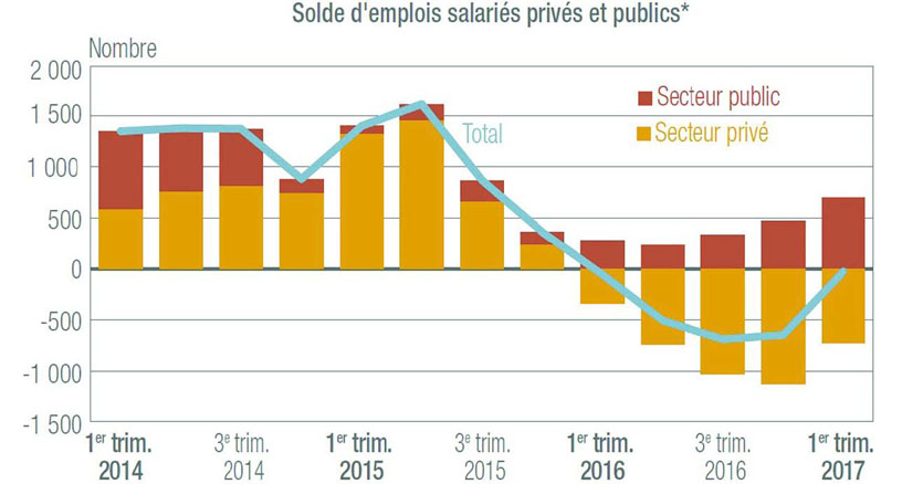 - Economie. L’Institut de la statistique et des études économiques a publié hier son analyse du premier trimestre. Sur un an, le nombre de postes salariés reste stable. Le privé enregistre encore des pertes, compensées par les créations du public.■ Le solde est revenu à zéro Après quatre trimestres consécutifs dans le négatif, la courbe a regagné la ligne centrale. Le solde est revenu à zéro, à quelques unités près. Entre le 31 mars 2016 et le 31 mars 2017, on peut dire que l’économie calédonienne n’a ni perdu ni gagné dIl vous reste 89% de l'article à découvrir.Cet article est réservé aux abonnés.