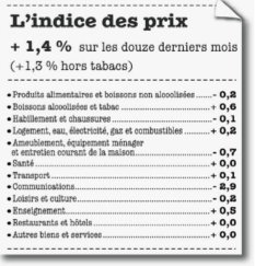 - Economie. Après trois mois de hausse successiveL’indice des prix à la consommation établi par l’Institut de la statistique et des études économiques (Isee) affiche une baisse moyenne des prix de 0,1 % pour le mois de juillet. Après trois mois de hausse successive (+0,3 % en avril ainsi qu’au mois de mai, et +0,1 % enIl vous reste 86% de l'article à découvrir.Cet article est réservé aux abonnés.