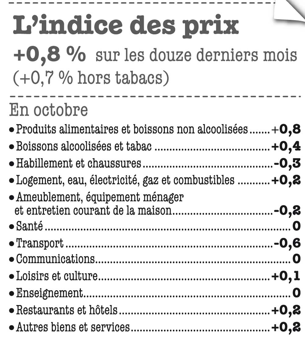 - Economie. Hausse de 1 % en octobreL’indice des prix à la consommation a augmenté de 0,1 % au mois d’octobre. Il a été fixé par les services de l’Isee (Institut de la statistique et des études économiques) à 105,31 contre 105,22 le mois précédent. Si les prix des produits manufacturés et des servicesIl vous reste 86% de l'article à découvrir.Cet article est réservé aux abonnés.