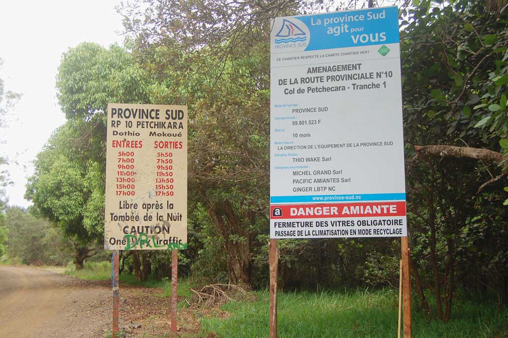 - Aménagement. Chantier surveillé sur la route à horaireLa province Sud a lancé depuis un mois la première tranche des travaux d'aménagement de la route provinciale numéro 10 à Thio, dite route du col de Petchikara ou route à horaire. Une voie amiantée qui nécessite des précautions particulières.« Danger amiante ». En lettres capitales blanches sur fond rouge, l’avertissement saute aux yeux. « Fermeture des vitres obligatoire, passage de la climatisation en mode recyclage », annonce aussi le panneau d’information du chantier destiné auxIl vous reste 96% de l'article à découvrir.Cet article est réservé aux abonnés.