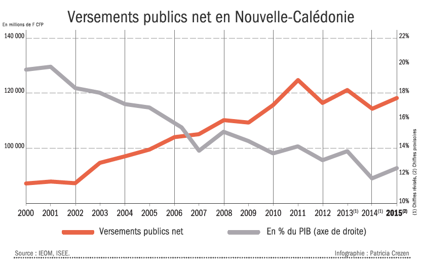 - Finances. L’Institut d’émission d’outre-mer, dans son rapport annuel publié jeudi, a mis en évidence la diminution des transferts. Même du temps de leur augmentation, avant 2011, ils perdaient déjà de leur importance dans l’économie locale.Les versements de l’État en Nouvelle-Calédonie perdent de leur importance. En valeur, la diminution est à la fois récente et minime (courbe rouge, ci-contre). Mais si l’on parle de leur poids dans l’économie locale (courbe grise), la chute est une affaire de long terme. C’est l’un desIl vous reste 95% de l'article à découvrir.Cet article est réservé aux abonnés.