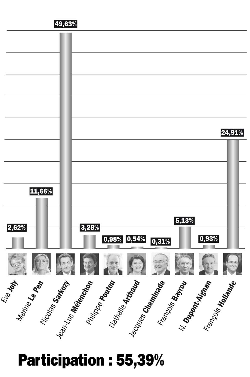 - Avec 49,63 % des suffrages, Nicolas Sarkozy égale pratiquement son score de 2007. François Hollande arrive deuxième avec 24,91 %, en progression de 1,2 point. Marine Le Pen fait plus que doubler le score du FN. Mais la participation chute à 55,39 %.Les électeurs calédoniens font toujours confiance à Nicolas Sarkozy, même s’ils se sont moins intéressés à l’élection présidentielle qu’il y a cinq ans. C’est l’un des enseignements du premier tour de scrutin qui s’est déroulé hier. On retiendra aussiIl vous reste 92% de l'article à découvrir.Cet article est réservé aux abonnés.