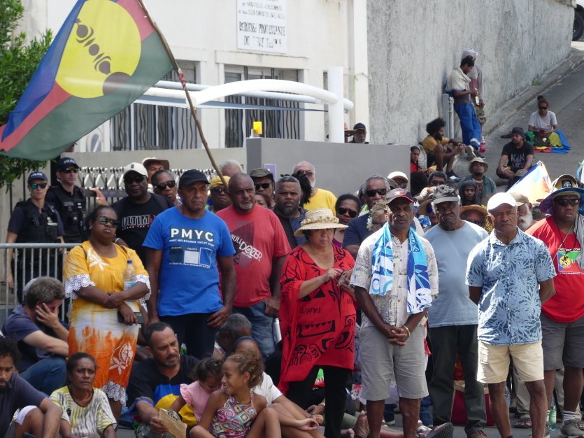 Les manifestants demandaient aux élus, réunis au même moment en commission, d’émettre un avis négatif sur le projet de loi organique pour reporter les élections provinciales 2024. Photo Baptiste Gouret"On est ici parce que l’avenir du pays doit se décider avec les gens du pays, et qu’en ce moment on est train de décider pour nous", martelait au micro Hervé Tein-Taouva, membre actif de la cellule.