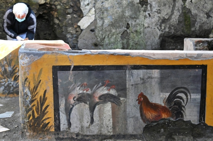 Une fresque mise au jour dans le quartier du thermopolium, sorte de "fast-food" de rue dans la Rome antique, le 25 janvier 2021 sur le site archéologique de Pompéi, près de Naples Andreas SOLARO [AFP]