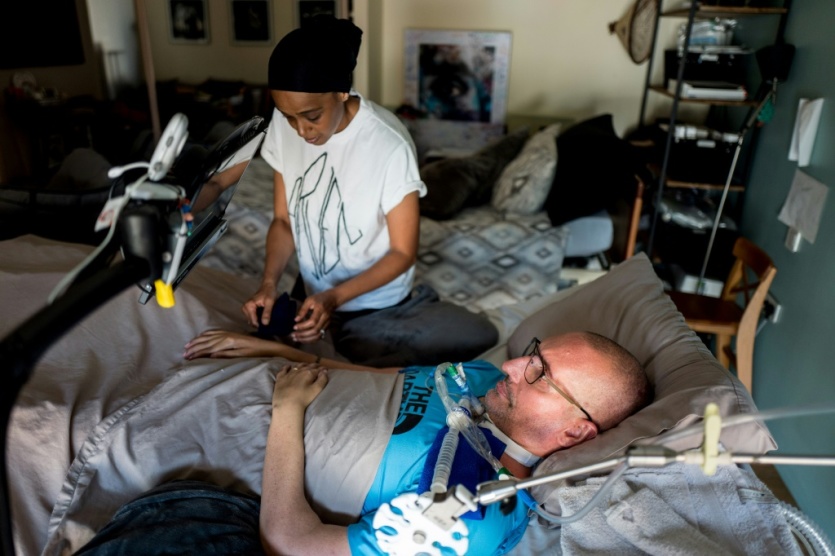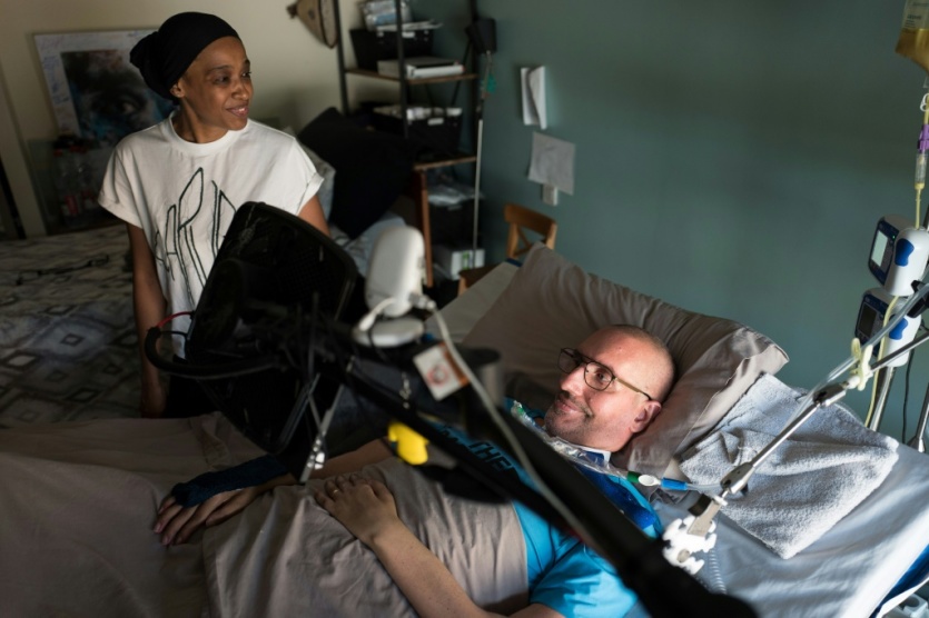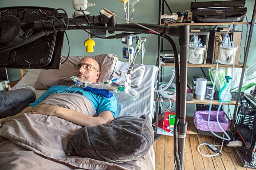 "En parlant de ça avec des médecins, des infirmières, des aides soignantes et des auxiliaires de vie, j'ai non seulement constaté que ce manque (de formation) était important, mais qu'il y avait chez la plupart d'entre eux, une volonté d'être formé", déroule l'artiste. Lui est alité, relié par des tubes à un respirateur artificiel, chez lui, à Gaillac (Tarn) et vit aux côtés de sa femme et ses deux filles.