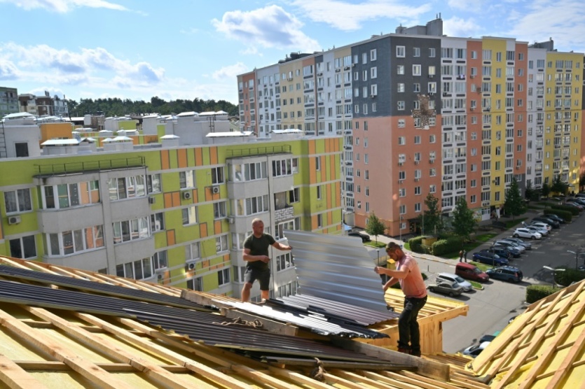 Des ouvriers réparent un toit endommagé par les combats, le 16 septembre 2022 à Irpin, ville en banlieue de Kiev Sergei SUPINSKY [AFP]