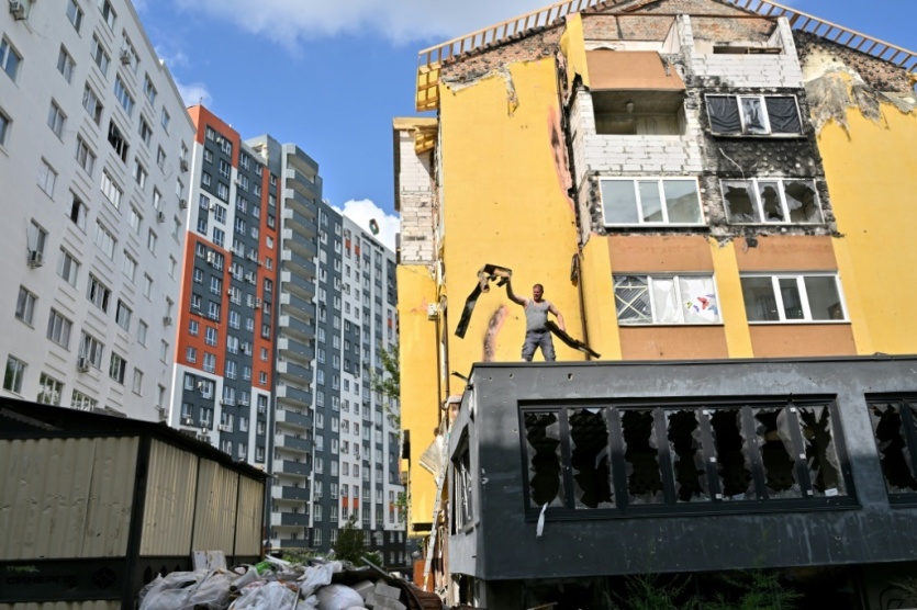 Un ouvrier déblaie des gravats d'un bâtiment endommagé par les combats, le 16 septembre 2022 à Irpin, ville en banlieue de Kiev Sergei SUPINSKY [AFP]