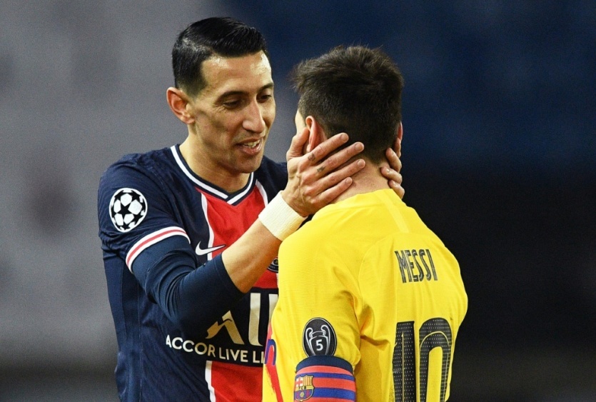 Accolade entre la star du Barça Lionel Messi et son compatriote argentin du PSG Angel di Maria à l'issue du match de Ligue des champions à Paris, le 10 mars 2021 FRANCK FIFE [AFP/Archives]MERCI DE VOUS IDENTIFIER