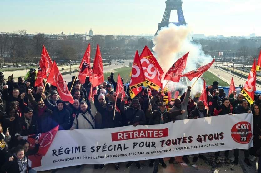 - | Crée le 10.02.2023 à 13h32 | Mis à jour le 11.02.2023 à 04h30ImprimerDes membres de la CGT manifestent contre la réforme des retraites sur le parvis du Trocadéro, le 9 février 2023 à Paris Alain JOCARD [AFP]L'article 1er a été adopté au bout de longues heures, et les débats butent sur des attaques ad hominem: l'examen de la réforme des retraites était à la peine vendredi à l'Assemblée nationale, à la veille d'une nouvelle mobilisation espérée massive par les syndicats.