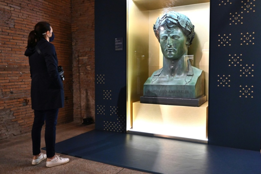 Une visiteuse admire un bronze "Buste de Napoléon 1er, empereur" du sculpteur italien Lorenzo Bartolini, lors de l'exposition "Napoléon et le mythe de Rome" au Musée des marchés de Trajan, le 11 mars 2021 à Rome ANDREAS SOLARO [AFP]