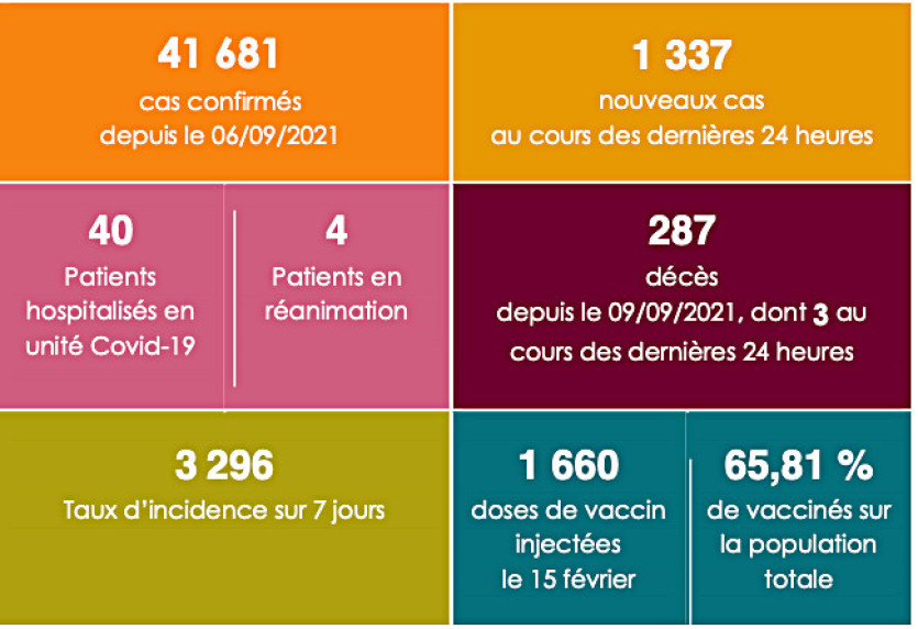 - | Crée le 16.02.2022 à 16h40 | Mis à jour le 16.02.2022 à 16h40ImprimerPoint sanitaire du gouvernement à la date du 16 février. Photo DRLe taux d’incidence cumule sur 7 jours glissants est de 3 296 pour 100 000 habitants.