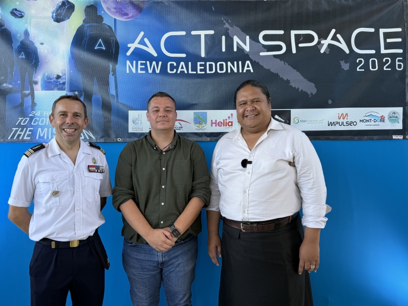 Act In Space, hackathon autour de l’espace organisé par le CNES et l’ESA, et porté en Nouvelle-Calédonie par le Gouvernement de la Nouvelle-Calédonie. Alban Genre-Grandpierre, commandant de la base aérienne 186 à la Tontouta, Kevin Decludt, chargé de projet spatial et innovation et Petelo Sao, membre du gouvernement chargé de l’innovation technologique. Photo Aurélia DumtéCréer des informations franco-françaises